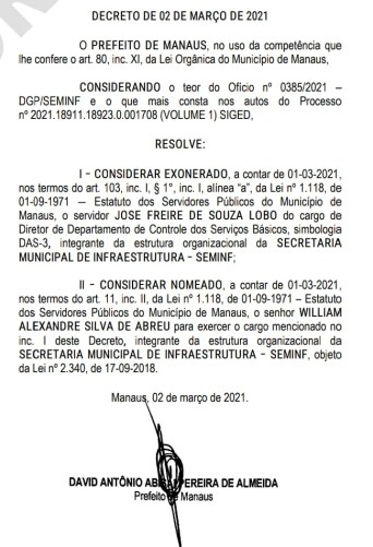 MANAUS – O ex-vereador de Manaus e ex-secretário da Secretaria de Estado de Justiça, Direitos Humanos e Cidadania (Sejusc), William Alexandre Abreu, foi nomeado nesta terça-feira (2), no cargo de Diretor de departamento de controle dos serviços básicos, na Secretaria Municipal de Infraestrutura (Seminf).